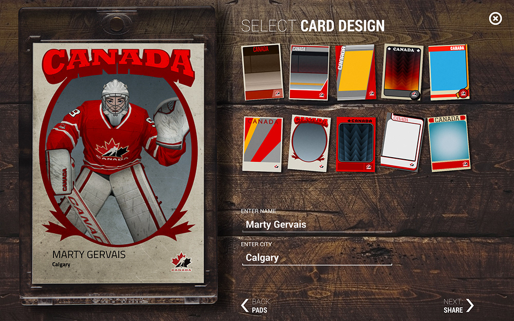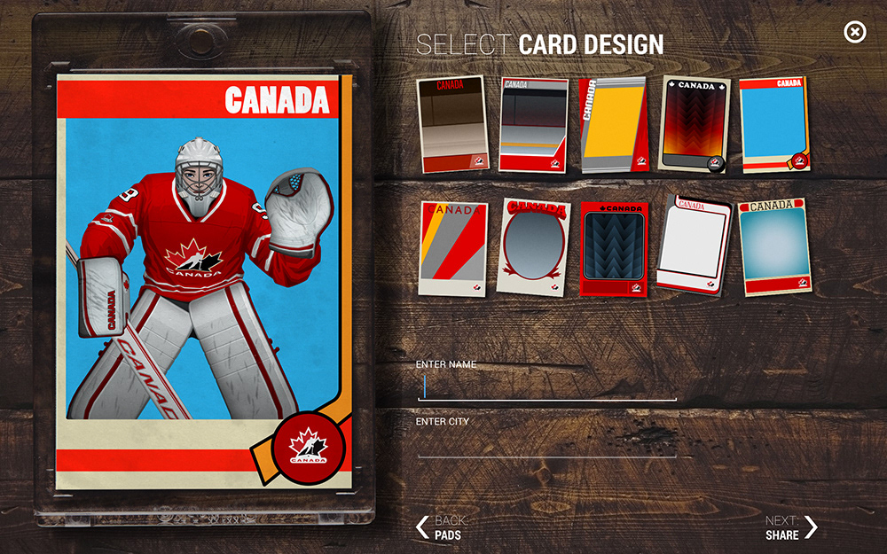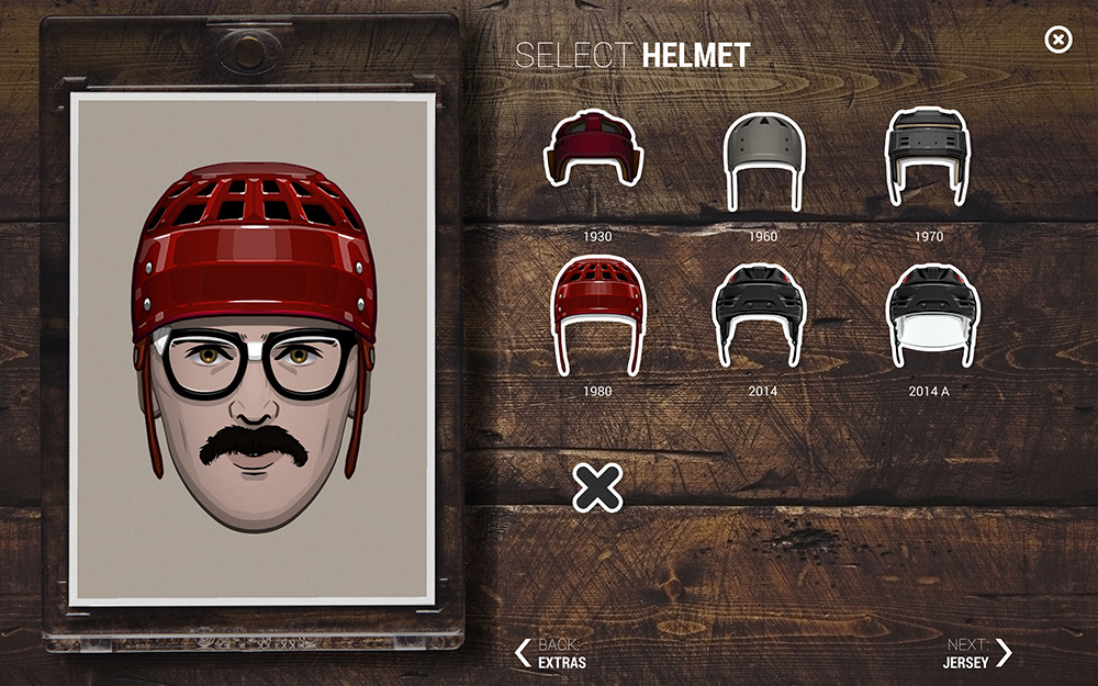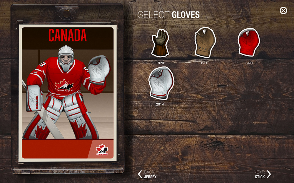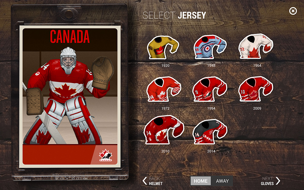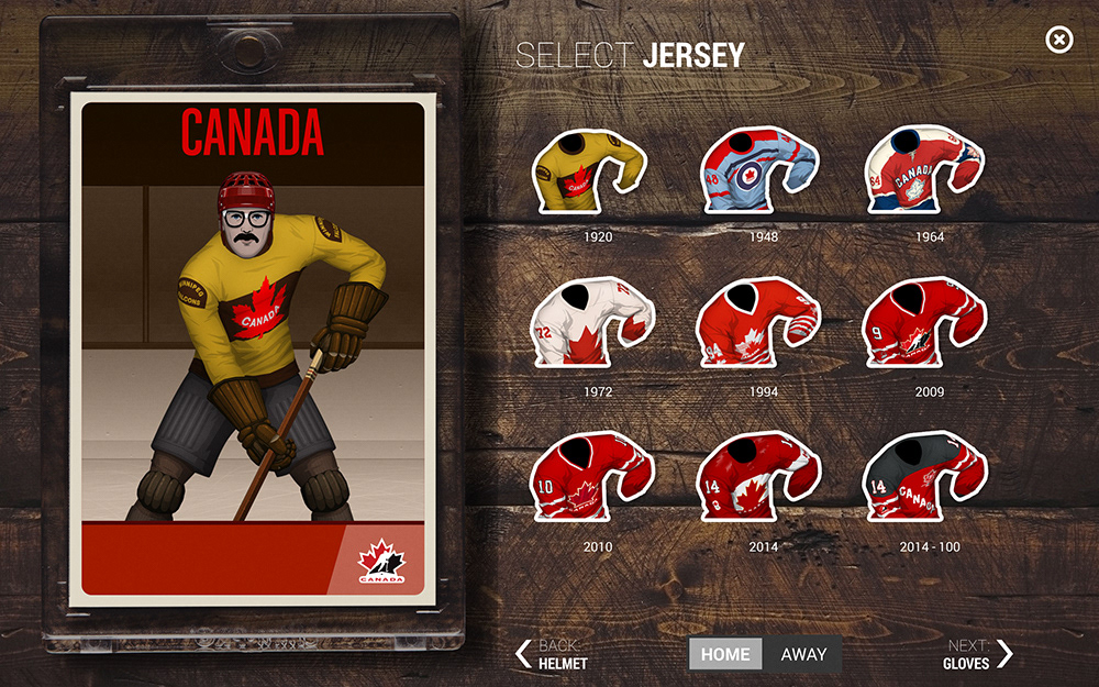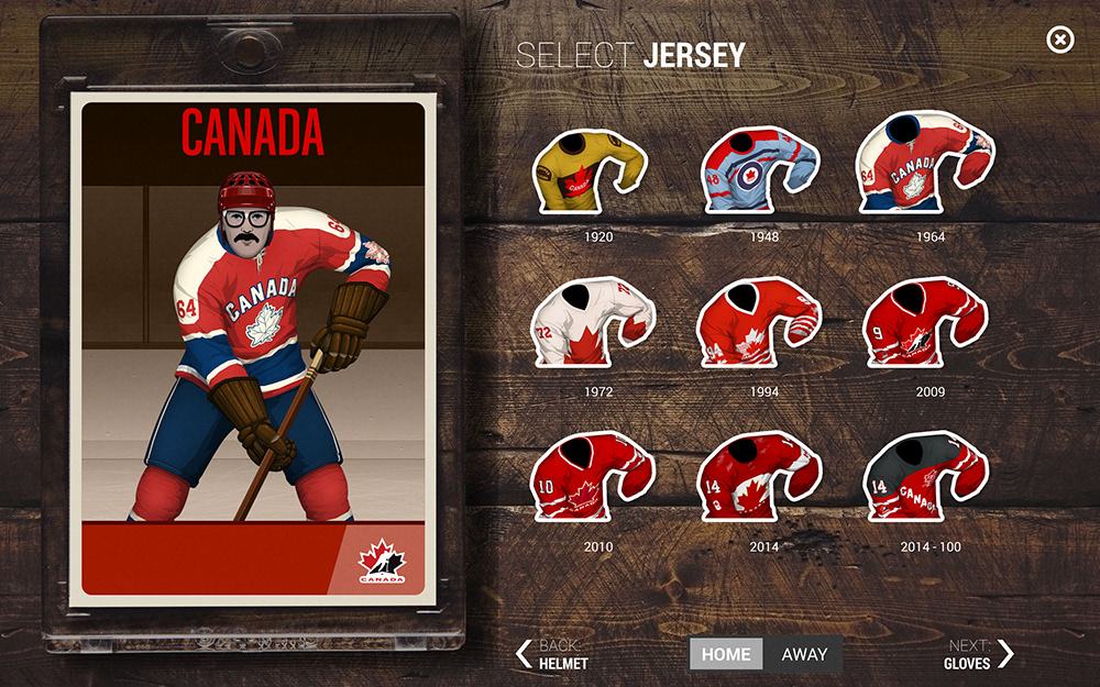 The folks at App Colony were asked to create an interactive experience that celebrated Hockey in Canada. Part of the app was a configurator and I was tasked to create all of the assets needed to customize your own hockey player. This included male and female facial parts as well as various eras of Team Canada jerseys and equipment. As a take-away, users were able to email themselves hockey cards featuring the custom player they created. The app was part of a larger exibit which toured the country, inspiring people with the history of hockey in Canada. The app was designed by App Colony and presented on high resolution Samsung tablets.